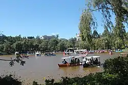 Burnham Lake, formerly known as the City Pond,[18] is about a century-old man-made lake situated at the center portion of Burnham Park. In early 2013, it underwent dredging which saw the removal of a meter (3.28 feet) thick silt sitting on the lake's bed. It was also dredged in 1994. After the 2013 dredging, the lake's volume is 34,000 cubic meters (1,200,000 cu ft).[19] The depth of the body of water is about 3.04 meters (10.0 ft). Boat rentals are available in the lake catering to tourists and residents.[20]