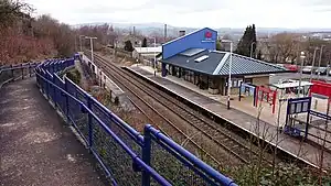 To replace Burnley Thorneybank, a new station on the Gannow Junction extension named Burnley Manchester Road was built on the north-western side of Manchester Road, and it opened on 1 November 1866.[1][7] It had two stone platforms, a modest single-storey main building on the eastbound ("up") side and a smaller waiting room with toilets on the opposite side.[8]