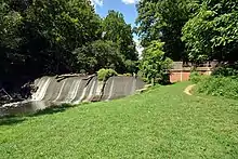 In the 1700s, a water mill was built at the easternmost corner of Four Corners, where today's Colesville Road passes over the Northwest Branch of the Anacostia River and becomes Columbia Pike. The mill building burned down in 1788, hence the name Burnt Mills. Rebuilt in the late 1700s or early 1800s, ownership of the mill changed hands several times in the 19th century before closing down in the early years of the 20th century. The land was then donated to the Boy Scouts of America, who established a camp named for President Woodrow Wilson.[11] In the early 1920s, the Boy Scouts donated part of the land to the Washington Suburban Sanitary Commission, and a temporary water filtration plant was erected at the site. Work on a new plant was completed in 1936, and the plant was named for the Washington Suburban Sanitary Commission's chief engineer, Robert B. Morse Filtration Plant. The dam and the two Georgian Revival pump houses were acquired by the Maryland-National Capital Park and Planning Commission between 1996 and 2000 and are now on the Historic Register. The Burnt Mills Dam parks (East[12] and West[13]) are a popular starting point for hikers of the Northwest Branch Trail, part of the Rachel Carson Greenway, whose northernmost section runs along the eastern and northern border of the neighborhood.[14][15][16]