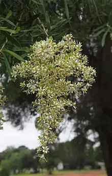 Bursaria incana, commonly known as prickly pine, box thorn, native box, native olive and mock orange,[2] is a species of flowering plant in the family Pittosporaceae and is endemic to northern Australia. It is a tall shrub or small, sparse tree with softly-hairy foliage, heart-shaped leaves with the narrower end towards the base, leafy groups of white flowers with five spreading sepals, five spreading petals, and flattened fruit.