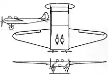 It had a tailskid undercarriage with independently mounted wheels 1.665 m (5 ft 5.6 in) apart.[1] Each wheel was mounted on its own axle, about 700 mm (28 in) long and hinged at its inner end to a vertical strut from the inboard fuselage underside and another, outward leaning one above the axle to the centre-section near its edge. A faired vertical leg with a steel tube core from near the edge supported the outer axle end on a rubber shock absorber. Four cables supplied fore-and-aft rigidity.[1][4]
