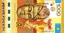 The Bust of Kul Tigin is depicted on a KZT 1,000 tenge banknote, issued by the Kazakh government.[5] The issue of the commemorative banknote was confirmed by the Kazakh government on December 12, 2013.[5] The banknote was dedicated to the Second Turkic Khaganate on both sides, with the Silver Deer on one side, and the Bust of Kul Tigin on the other. About 10 million banknotes were put in circulation by the National Bank of Kazakhstan.[5][6]