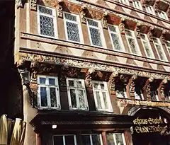 The Butcher's Guild Hall, an example of half-timbered building, is one of the largest structures in the Historic Market Place of Hildesheim. With its 7 floors and a height of 26 metres, it is considered to be one of the tallest half-timbered houses in Germany. The roof has a dimension of 800 square metres.[1] The portal has a width of 2.35 meters. The façade is decorated with colourful wood carvings, paintings, and German proverbs.
