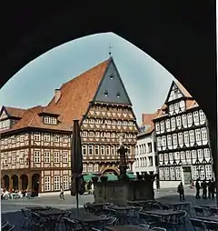 At the beginning of the 1980s, the hotel in the Market Place went bankrupt and the expanding Municipal Savings Bank needed a larger building. On this occasion, the city council decided to tear down the concrete buildings and to reconstruct the historic Market Place of Hildesheim in the original style. Many inhabitants of Hildesheim donated money for the project and provided old photos and drawings. Some of the old construction plans of the Butchers' Guild Hall were preserved. The foundation stone was laid on 27 October 1987.[5] 400 cubic metres of oak wood, 7,500 wooden pegs and 19,000 roof tiles, which were nearly 150 years old, were used.[6] The Roofing Ceremony was held on 15 January 1989, and the reconstruction was completed in December 1989.[7] The total costs of reconstructing the Butcher's and Bakers' Guild Halls amounted to DM 13.6 million, approximately €7 million.