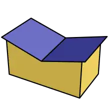 The form has no gutter as rainwater can run off the roof in no more than two locations, at either end of the valley, often into a scupper or downspout. The form may be symmetrical, with the valley located in the center, or asymmetrical with an off-center valley.[4] The valley itself may be flat, with a central roof cricket diverting water towards the valley ends, or sloping if the entire roof form is tilted towards one end of the valley.