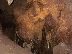 The cave consists primarily of dark limestone rocks of the middle trias, formed in tectonic cracks by water corrosion, the demolition of some parts of the ceiling and gradually enlarged by the underground river Bystra. An underground stream still flows through the bottom part of the cave, springing out in the village of Valaska. The embellishment of the cave consists of stalactites and stalagmites, from which Zvonivé stalaktity (Ringing statlctites), Beldachýn (Baldaquin) and Kovacska vyhna (Blacksmith's workshop) are specially remarkable. Except for many erosive forms a ceiling river-bed is to be seen in the cave, in which the round granit stones of the Low Tatras are attached by sinter. The cave is 2,637 metres (8,652 ft) in length and 95 metres (312 ft) in depth. It is the most important cave of the Upper Hron River Valley.[2]