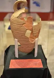 In 1768, 260 late Roman North African amphorae were found stacked in a chamber of the Kortin[upper-alpha 8] warehouses, twenty four of which had graffiti of a religious nature on them.[37] Given the distance from the main town, historians assume that these warehouse facilities were used for redistribution towards other harbours in the Central Mediterranean.[37] Large quantities of Byzantine era pottery were also found at the Kortin promontory in Marsa, with traces of a fire leading excavators to assume that the buildings and the quay were abandoned in late eight or early ninth century, with the date established due to the presence of globular amphorae on site.[38] The presence of earlier ceramics at the same level may indicate an earlier abandoning.[38]