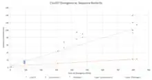 The m value, or number of corrected amino acid changes per 100 residues, for the C1orf27 gene was graphed against the species divergence in millions of years. When compared to divergence graphs of fibrinogen and cytochrome C, it was determined that this gene closely resembles the evolutionary pattern observed in fibrinogen, suggesting a more rapid rate of evolution. M values for C1orf27 were calculated using the percentage of identity, when compared to humans, observed in the mRNA sequences of the orthologs using the formula derived from the Molecular Clock Hypothesis.