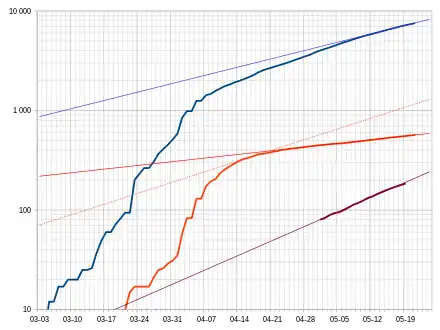- On 20 April, 89 new confirmed cases and 9 new deaths over the last 24 hours have been recorded, bringing the number of confirmed cases to 2718 and that of deaths to 384.[104]