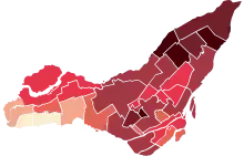 ![]() Map of boroughs and municipalities in Montreal by COVID-19 cases per 100,000 (as of May 20, 2022).[1]