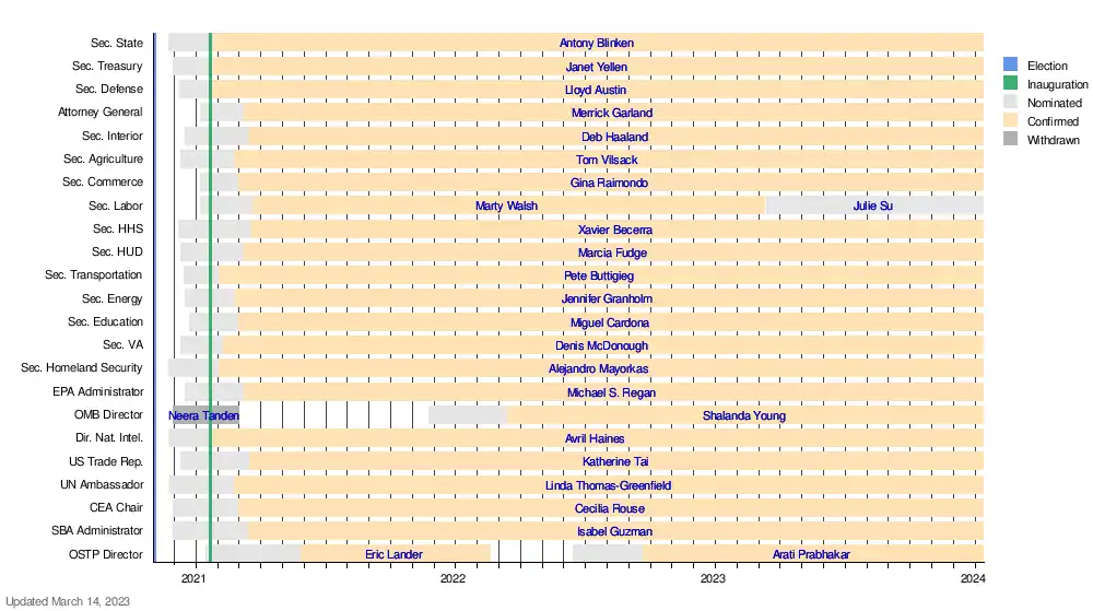 - ↑ Jaffe, Alexandra (March 2, 2021). "Biden's Cabinet half-empty after slow start in confirmations". Associated Press. Retrieved March 2, 2021.