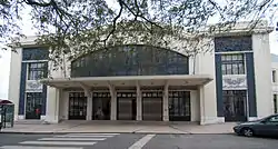 Attached to the main building are two similar annex bodies with identical facades, consisting of two floors of simple rectangular spans decorated in intervals by geometric mosaic panels.[1] The northern rectangular body, covered in tile, has an extensive facade that parallels the public roadway. The eastern annex is an "L"-shape building with lateral facade oriented to the south that correspond to administrative services.[1] Juxtapositioned to the main body on either side are triangular spans with curved apex that resembles the decorative discourse of the main facades.[1]