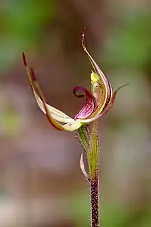 Caladenia leptochila, commonly known s narrow-lipped spider-orchid or narrow-lipped caladenia,[2] is a species of flowering plant in the orchid family Orchidaceae and is endemic to South Australia. It is a ground orchid with a single slender, hairy leaf and one or two yellowish-green and reddish-brown flowers.