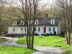 A short way north of the main house stands a 1+12-story Cape, also of wood-frame construction. It has a side-gable roof pierced by two gabled dormers, a central chimney, and clapboarded exterior. A three-bay ell to the left nearly doubles the size of the house; it houses a secondary entrance, and its roof has three dormers. The main entrance features a Greek Revival surround. This house was built in 1836, by family lore due to a dispute involving a spinster aunt, who then resided here.[2]