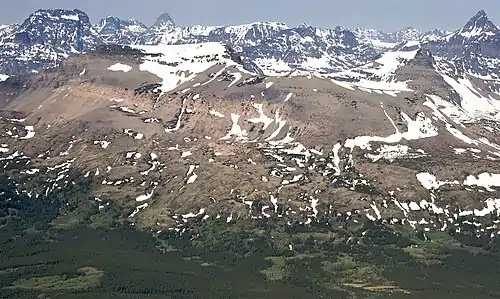 Calf Robe Mountain is a 7,948-foot-elevation (2,423-meter) mountain summit located in Glacier National Park in the U.S. state of Montana.[3] It is situated on the Continental Divide in the Lewis Range, and can be seen from Highway 2 midway between Marias Pass and East Glacier Park. The summit is set on the border shared by Flathead County and Glacier County. Topographic relief is significant as the east aspect rises 2,500 feet (760 meters) in one mile. The immediate area between the mountain and highway is known for its aspen and beaver dams.[4]
