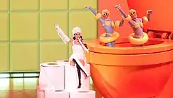 The video was directed by Mathew Cullen and was inspired by the work of Will Cotton, who was also the artistic director of the video.[40][41] Filming of the video began on May 14, 2010. It premiered on June 15, 2010.[42][43] Perry explained the use of a candy theme instead of a beach theme for the video, saying, "It's definitely something to watch when you have the munchies. ... It's all edible. We named it 'Candyfornia' instead of 'California', so it's a different world," she said. "It's not just like, 'Oh, let's go to the beach and throw a party and then shoot a music video!' It's more like, 'Let's put us California Gurls in a whole different world!"[44] The video has been controversial since there were several accusations of plagiarism against Perry, one due to similarities between the video and "Fergalicious" by Fergie, particularly in the sets and the outfits.[45]