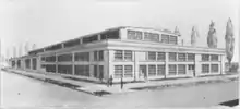 The one-story plant building measured 110 by 150 feet (34 m × 46 m) in size, and was of reinforced concrete construction. There was a mezzanine floor on three sides. The ceiling measured 37 feet (11 m) in height, and the sides were largely made up of windows. The all white exterior was surrounded with lawn, flowers, and shrubs. A pergola, 110 feet (34 m) in length, reached from the southern extremity of the building to Romaine Street and was intended as a dining area for employees. On two sides of the building, there was a wide concrete driveway.[2]