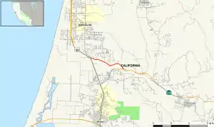Except where prefixed with a letter, postmiles were measured on the road as it was in 1964, based on the alignment that existed at the time, and do not necessarily reflect current mileage. R reflects a realignment in the route since then, M indicates a second realignment, L refers to an overlap due to a correction or change, and T indicates postmiles classified as temporary (for a full list of prefixes, see California postmile § Official postmile definitions).[1] Segments that remain unconstructed or have been relinquished to local control may be omitted. The entire route is in Humboldt County.