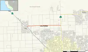 Except where prefixed with a letter, postmiles were measured on the road as it was in 1964, based on the alignment that existed at the time, and do not necessarily reflect current mileage. R reflects a realignment in the route since then, M indicates a second realignment, L refers to an overlap due to a correction or change, and T indicates postmiles classified as temporary ().[1] Segments that remain unconstructed or have been relinquished to local control may be omitted. The entire route is in Stanislaus County.