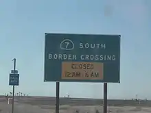 SR 7 begins at the Calexico East Border Station, which is open from 6 am to 10 pm, seven days a week.[3] Just north of the border, the highway splits into two roads to pass through the customs checkpoints: the fork to the west is for cars, and the fork to the east is for commercial vehicles. The California Department of Transportation (Caltrans) considers the western fork for cars as the SR 7 spur route, while the eastern fork is part of SR 7 proper. At their junction, the western fork passes over the other fork at the northern end and merges into that highway.