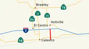 Postmiles were measured based on the road's original alignment and do not necessarily reflect current mileage. The "S" prefix refers to the spur route that splits off at the Calexico East Port of Entry to pass through the western customs checkpoints for cars.[9][16] The entire route is in Imperial County.