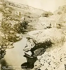 Miners worked at a claim only long enough to determine its potential. If a claim was deemed as low-value—as most were—miners would abandon the site in search of a better one. In the case where a claim was abandoned or not worked upon, other miners would "claim-jump" the land. "Claim-jumping" meant that a miner began work on a previously claimed site.[82][83] Disputes were often handled personally and violently, and were sometimes addressed by groups of prospectors acting as arbitrators.[77][82][83] This often led to heightened ethnic tensions.[84] In some areas the influx of many prospectors could lead to a reduction of the existing claim size by simple pressure.[85]