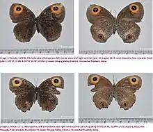- ↑ Singh, A.P. (26 April 2015). "On the female morphs, ecology and male genitalia of Callerebia dibangensis Roy (Lepidoptera: Nymphalidae: Satyrinae) recorded near Mayodia Pass in lower Dibang Valley, Arunachal Pradesh, India". Journal of Threatened Taxa. 7 (5): 7168–7174. doi:10.11609/JoTT.o4035.7168-74.