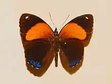 The wingspan is 30–40 mm.[3] Adults are black with a broad, orange or red area on the forewings and a blue area on the hindwings. There is a rare form, ab. confluens, found in central Peru, in which the black markings on the underside are greatly enlarged.