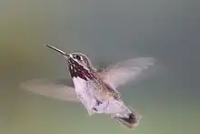 During courtship, a male calliope hummingbird hovers at accelerated wingbeat frequency up to 95 flaps per second (42% higher than normal hovering), creating a loud buzzing sound, with throat feathers protruding and facing a female.[3][8] The male then ascends temporarily to 20 meters and dives at high speed, with the rapid descent causing sonation of wing and tail feathers combined with vocalization, intending to attract attention of the female.[8] Research in a wind tunnel demonstrated that the male courtship display includes sounds produced by three independent feather or vocal components, each with different acoustic characteristics, thus potentially containing different messages appealing to the female.[8] The tail feathers flutter at high frequency and hit each other to produce the buzzing sound.[9]