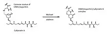 The leptomycin family of molecules that callystatin belongs to includes several well-known molecules with cytotoxic properties.[1][4] such as leptomycins A and B,[5][6] anguinomycins A and B,[7] kazusamycin,[8] and leptofuranins A-D.[9] All of these molecules were isolated from various strains of Streptomyces sp. and share a common structural motif consisting of a terminal α,β-unsaturated lactone group attached to a long unsaturated fatty acid chain which includes two diene systems separated by two sp3-hybridized carbons.[4][10] It is believed that this highly conserved structural motif is important for biological target recognition with the α,β-unsaturated lactone moiety serving as the pharmacophore of the molecule.[4]