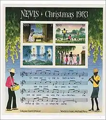 In 1983, the Caribbean island of Nevis featured the chorus of "Calypso Carol" on a miniature sheet of its 1983 Christmas stamps, designed by Jennifer Toombs.[4] The neighbouring island of St Kitts issued a complementary sheet with the slightly older song "Mary's Boy Child".