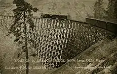 In addition to its wooden trestles, the railroad's second subdivision also had a sizable steel viaduct, 1,520 feet (460 m) in length with a maximum height of 280 feet (85 m).[11][12] Bridge 38 spans Lawyer's Canyon, between Craigmont and Ferdinand, and is visible from U.S. Route 95.
