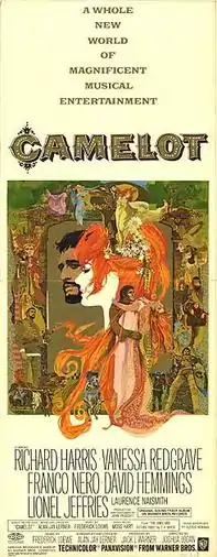 Camelot is a 1967 American musical fantasy drama film directed by Joshua Logan and written by Alan Jay Lerner, based on the 1960 stage musical of the same name by Lerner and Frederick Loewe. It stars Richard Harris as King Arthur, Vanessa Redgrave as Guenevere, and Franco Nero as Lancelot, with David Hemmings, Lionel Jeffries and Laurence Naismith.