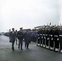 Kennedy had hoped not to surpass but to compete with French influence in Africa – and not only in Cameroon itself: because of its geographical location and bilingualism, Cameroon provided a "gateway" to other Central African countries.[3] More practically, during certain periods (1970–1981, and later 1995–2006), the U.S. used Yaoundé as a base for monitoring its interests in Equatorial Guinea.[3] Expanding U.S. influence in Africa was also viewed as a tactic for communist containment and security cooperation in the Cold War, and Ahidjo played up this dimension, alerting Kennedy, during their 1962 meeting, to the subversive communist threat posed by UPC in Cameroon.[1][3] Ahidjo, for his part, sought to diversify Cameroon's foreign relations, reducing its economic and political dependence on France, its former colonial power:[1] Cameroon was studiously non-aligned in the Cold War, but its strong orientation towards France was apparent, and was occasionally restrictive.[5] Ahidjo was particularly interested in the economic assistance that the U.S. could offer.[1]
