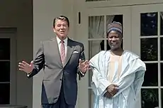 President Ahidjo on a working visit with President Ronald Reagan in the White House Rose Garden, July 1982.