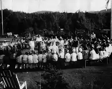 Camp Massad was founded in 1947 by the Keren Hatarbut Ha'Ivri under the leadership of Aron Horowitz and a small group of Canadian Hebraists.[6] Horowitz had previously founded Camp T'chiyah in Calgary in 1944, the first Hebrew-speaking summer camp in Canada. Massad's first president, Isaac Gold, invested three thousand dollars as a deposit for a camp-site at Lac Quenouille in the Laurentians. With the assistance of Gold and other philanthropists, Massad grew from a small camp-site with no pier, no level ground for sports, few showers, a short supply of drinking water, and one hall for both dining and activities.[7]