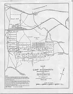 On July 13, 1917, the War Department indicated that a division of the New York National Guard would be organized and trained at the new Spartanburg-area camp.[3] Later in the month, the Department of War announced that the facility could be called Camp Wadsworth in honor of James S. Wadsworth, a prominent resident of New York who had served as a brigadier general in the Union Army during the American Civil War, and had been killed during the Battle of the Wilderness.[3][lower-alpha 1]