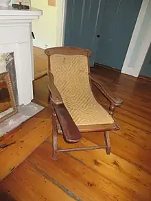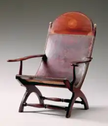 The Campeche (or butaca, as it is called in Spanish) is a reclining, non-folding, sling-seat chair with a distinctive side-placed curule base. In North America, they are named for the Campeche region of Mexico's Yucatán Peninsula, and were popular in the Americas during the early nineteenth century. Similar versions of the form are found throughout Europe, such as the Schinkel writing chair at Schloss Charlottenburg in Berlin.[1] Other related forms include the "planter's chair" or "bootjack" (that bears folding arms that extend outward as leg rests) which is associated with equatorial climes and plantation-based societies.