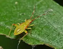 Campyloneura virgula can reach a length of 4–5 millimetres (0.16–0.20 in).[2] Adults have pale translucent hemelytra,[3] a red stripe on the edge of a pale green pronotum, a yellow scutellum. a black head, long red-banded antennae and bright yellow cuneus that are tipped with dark red.[2] Legs are pale yellow.[3] Nymphs are yellow, with a red stripe on the edge of the pronotum.[4]