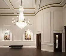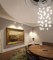 The building which would later become known as Canada House was built between 1824 and 1827 to designs by Sir Robert Smirke, the architect of the British Museum.[2] It was originally two buildings used by the Union Club and the Royal College of Physicians. Under the leadership of High Commissioner Peter Charles Larkin, the Canadian government acquired the Union Club in 1923 for the sum of £223,000.[3] It was Larkin's intention to centralise the work of 200 Canadian employees scattered among offices in Victoria Street in one central building. Renovations cost $1.3 million CDN and were supervised by the architect Septimus Warwick, who moved the main entrance from Trafalgar Square to Cockspur Street. The designers imported Canadian furniture, carpets and maple and birch flooring. The exterior was reclad in Portland stone to match the façade of the Royal College of Physicians. The building was officially opened on 29 June 1925 by King George V.[3]