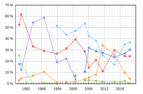 | Election | Liberal | Bloc Québécois | New Democratic | Conservative | Green | PC | Reform / Alliance |
