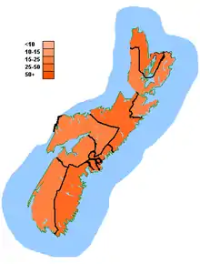 Today, the Liberals are at their strongest in Cape Breton and the Halifax area, the NDP are at their strongest in the Halifax area, and the Conservatives are at their strongest in rural mainland Nova Scotia. In 2015, the Liberals swept Nova Scotia in convincing fashion, winning an outright majority of the votes cast in all but one riding; that year, they won every seat in Atlantic Canada. In 2019, the Liberals maintained their dominance in the province, winning 10 out of 11 ridings, with one riding, West Nova, going Conservative. In 2021, the Liberal vote share was stable but they lost two additional seats, Cumberland—Colchester and minister Bernadette Jordan's South Shore—St. Margarets, to the Conservatives.