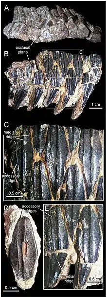 Canardia garonnensis. Part of the dental battery of the lower jaw in occlusal (A) and lingual (B) views. Details of the crowns of the same specimens (C, E) and of an isolated dentary tooth (D).[1]