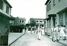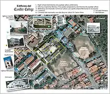 Colegio Buenavista was located in front of the entrances on the side of Candler, on the southwestern corner of 54th Street and 43rd Avenue.[9] The main Buenavista building had three entrances on Calle Miramar (Calle 54): the first was a gate to enter the main building, the beautiful mansion that was adapted to the initial needs of the school. On the ground floor were: the materials room, the kitchen, the dining room, and two classrooms. On the facade there were two converging stairs on a large terrace that gave access to the offices, the library, and the hall, from where a corridor led to the infirmary, the bedrooms and bathrooms for the pupils and the director, on the second floor.[9] On the third floor, there were more bedrooms for the older pupils and the missionaries. To the left of this building, there was an entrance for cars, gardens, a garage, and a small room. A hallway to the left led to the classrooms, lined along 54th Street and 45th Ave, which limited the large courtyard with its gardens. This included recreational areas, the platform for cultural activities, the Martian Corner and, on the other side, the tennis and volleyball court. A third entrance to the gardens of Calle Miramar led to a vestibule that separated a small religious meditation room and a classroom and the long corridor that gave access to classrooms. There was also an entrance through the back of the patio, on Calle Primelles (Calle 56). Crossing this street, a small door allowed access to the sports ground for the students of Buenavista. The Auditorium of both schools was built next to this land, located in the south-western corner of 56th Street and 43rd Ave. Diagonal to this, in the northeast corner, with the entrance by Ave. 43, was the building of two stories with a smaller playground for students from pre-school to third grade.