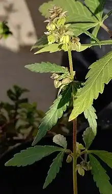 The flowers of Cannabis sativa are unisexual and plants are most often either male or female.[3] It is a short-day flowering plant, with staminate (male) plants usually taller and less robust than pistillate (female or male) plants.[4][5] The flowers of the female plant are arranged in racemes and can produce hundreds of seeds. Male plants shed their pollen and die several weeks prior to seed ripening on the female plants. Under typical conditions with a light period of 12 to 14 hours, both sexes are produced in equal numbers because of heritable X and Y chromosomes.[6] Although genetic factors dispose a plant to become male or female, environmental factors including the diurnal light cycle can alter sexual expression.[7] Naturally occurring monoecious plants, with both male and female parts, are either sterile or fertile; but artificially induced "hermaphrodites" can have fully functional reproductive organs.[8] "Feminized" seed sold by many commercial seed suppliers are derived from artificially "hermaphroditic" females that lack the male gene, or by treating the plants with hormones or silver thiosulfate.