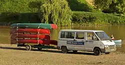 In addition to the craft themselves, the livery will often have one or more vehicles or trailers fitted out with special racks to enable transport of many craft efficiently. These vehicles can be quite large, holding as many as 20 craft or more. This is because usually the customers travel downstream from the livery and at the end of the journey, some provision for return must be made. Small liveries may have as few as four boats in their fleet, while large ones may have over one thousand.[2]