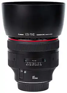 The Canon EF 85mm f1.2L II USM, with its included hood in place