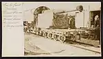 To load the gun the barrel lowered and a shell was brought forward by an elevated hoist within the cab. For large angles of traverse, the guns were pushed across a curved section of track for aiming. For small corrections, the guns had car traversing or "berceau" system which allowed 1° of left/right traverse by slewing the rear of the carriage on its bogies. The guns had a hydro-pneumatic cradle recoil system where the cradle recoiled up a slightly inclined rear deck which helped return the gun to battery after firing. Once in firing position, a section of rail bed was reinforced with wooden beams to support the weight of the gun.[4] Two steel beams under the center of the carriage were then lowered and the carriage was jacked up to take weight off the bogies and anchor the gun in place. The carriage also had a windlass towards the front of the carriage that would draw the carriage back into position after firing if the gun had moved. The success of the conversion led to the conversion of other large caliber naval guns such as the earlier Canon de 274 modèle 1887/1893. However, the armored cab, carriage traverse, and cradle recoil were not repeated in future Schneider railway guns. Instead, most used simpler and less costly "glissement" carriages with better angles of elevation and greater range.[4]