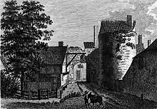 Towards the end of the 18th century, horse-drawn coaches became much more common in Canterbury, which lay at the centre of a new turnpike road system.[80] This required extensive changes to the city streets and gateways, which were typically too narrow to be easily navigated by these vehicles.[81] By 1779, Northgate and Burgate had been destroyed to allow wider entrances for the city.[82] Riding Gate was demolished in 1782, but in 1791 the local citizen James Simmons built a new, brick archway on the old foundations, which was rapidly occupied by a new house, blocking most of the gateway.[83] An iron bridge was later built over the site of Riding Gate.[84] The Worth Gate was demolished in 1791 and reused in a local garden, a new entrance being built in its place.[85] Newingate's drum towers were used as a water reservoir for the city, and the gatehouse was not demolished until 1801.[86] Sections of the wall were cut away to allow new roads to be built; the walls near St Radiguns's Public Baths were demolished in 1794 and the city wall around London Gate was demolished around 1800.[87]
