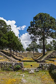 Its architecture is absent of stucco as decoration element, although mud was possibly used to join volcanic rock in addition to the technique of placing stone on stone, as was done to shape walls, alleys, platforms and other archaeological structures. There are two large prehispanic roads; these avenues are framed by high and thick volcanic stone walls, (some of them more than a kilometer long) that together with the streets and roads allowed access to the patios and ceremonial areas, constituting an important access control to the city and internal urban areas; this great fortress also had a moat that protected the city on its limits with the Valley, from possible invasions from this sector.[6]